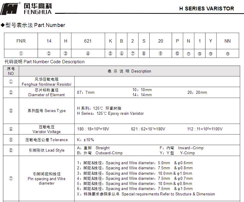 風(fēng)華高科H系列壓敏電阻器型號命名規(guī)則: