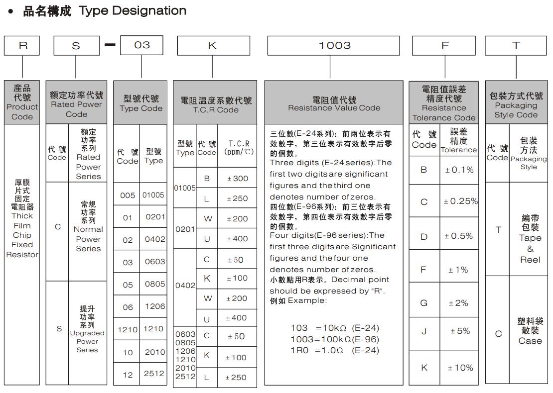 T -表示該貼片電阻的包裝形式為編帶包裝。除了編帶包裝外,貼片電阻還有塑料盒包裝(用B表示)和C(塑料袋散裝)兩種包裝方法。