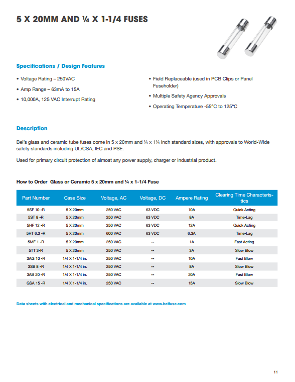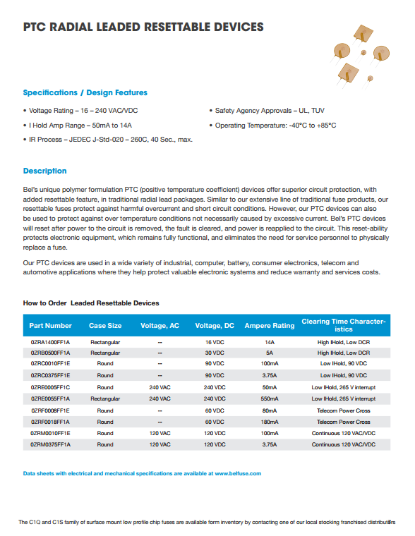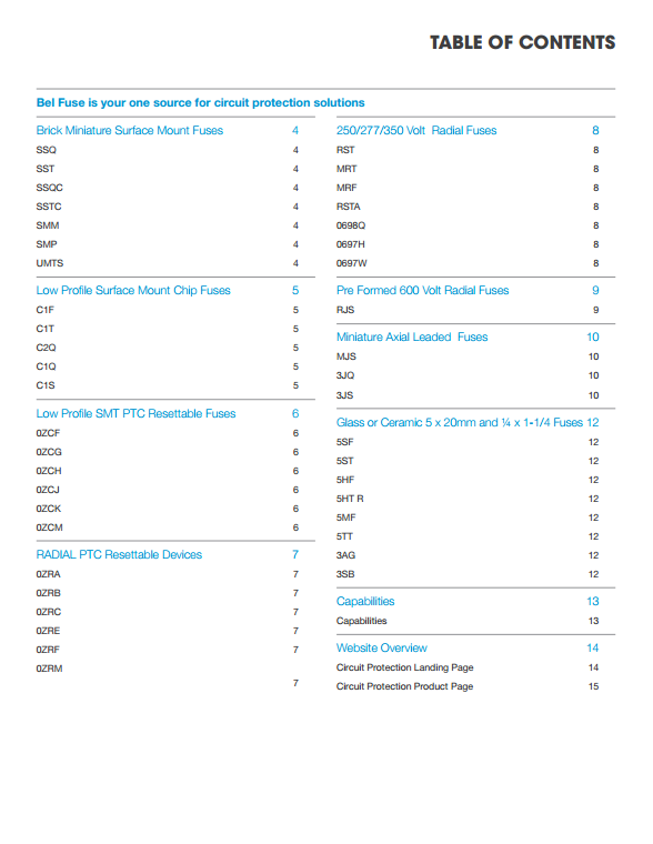 1、磚微型表面貼裝保險(xiǎn)絲 2、薄型表面貼裝芯片保險(xiǎn)絲 3、薄型SMD可復(fù)位器件 4、徑向PTC自恢復(fù)設(shè)備 5、250/277/350伏徑向保險(xiǎn)絲 6、預(yù)制600V徑向保險(xiǎn)絲 7、微型軸向引線保險(xiǎn)絲 8、玻璃和陶瓷保險(xiǎn)絲