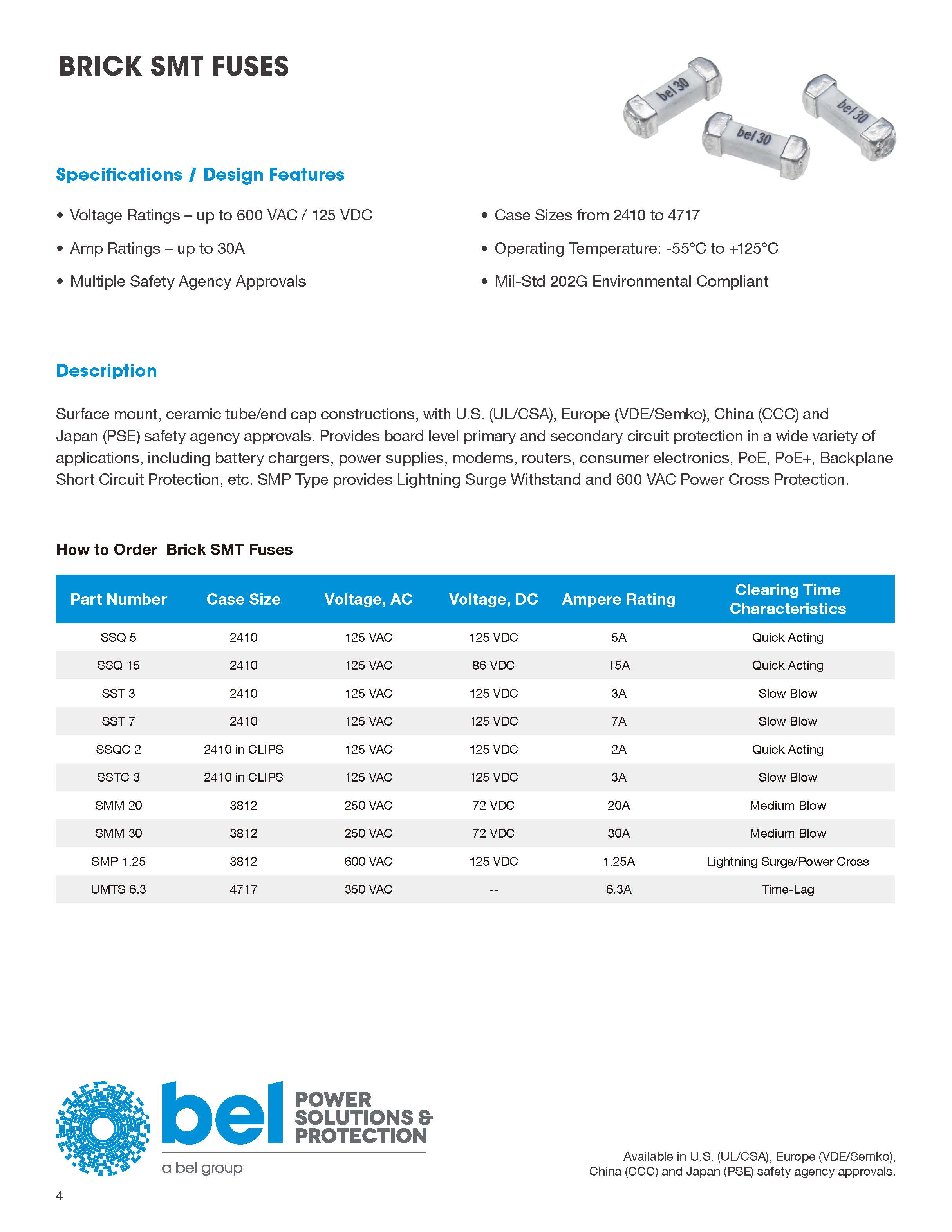 表面貼裝,陶瓷管/端蓋建筑,與美國(guó)(UL / CSA),歐洲(VDE / SEMKO),中國(guó)(CCC)和日本(PSE)安全機(jī)構(gòu)批準(zhǔn)。 提供各種各樣的板級(jí)初級(jí)和二級(jí)電路保護(hù)應(yīng)用,包括電池充電器,電源,調(diào)制解調(diào)器,路由器,消費(fèi)電子,PoE,PoE +,背板短路保護(hù)等。SMP型提供閃電浪涌耐受和600 VAC電力交叉保護(hù)