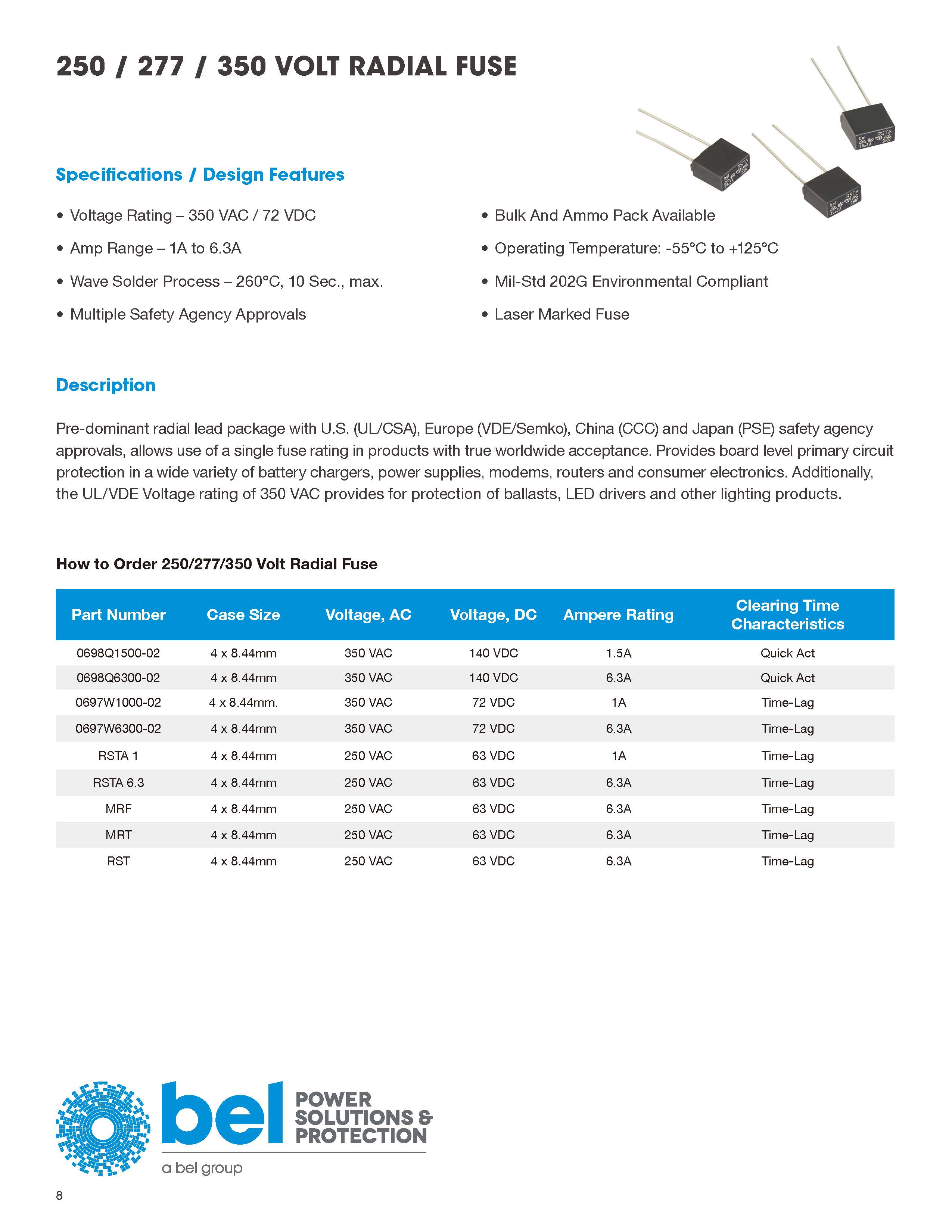 塑料主體和徑向引線保險(xiǎn)絲 經(jīng)美國(guó)(UL / CSA),歐洲(VDE / Semko),中國(guó)(CCC)和日本(PSE)安全機(jī)構(gòu)批準(zhǔn),允許在真正被全球接受的產(chǎn)品中使用單個(gè)熔斷器額定值。在各種電池充電器,電源,調(diào)制解調(diào)器,路由器,消費(fèi)類電子產(chǎn)品等中提供板級(jí)主電路保護(hù)。