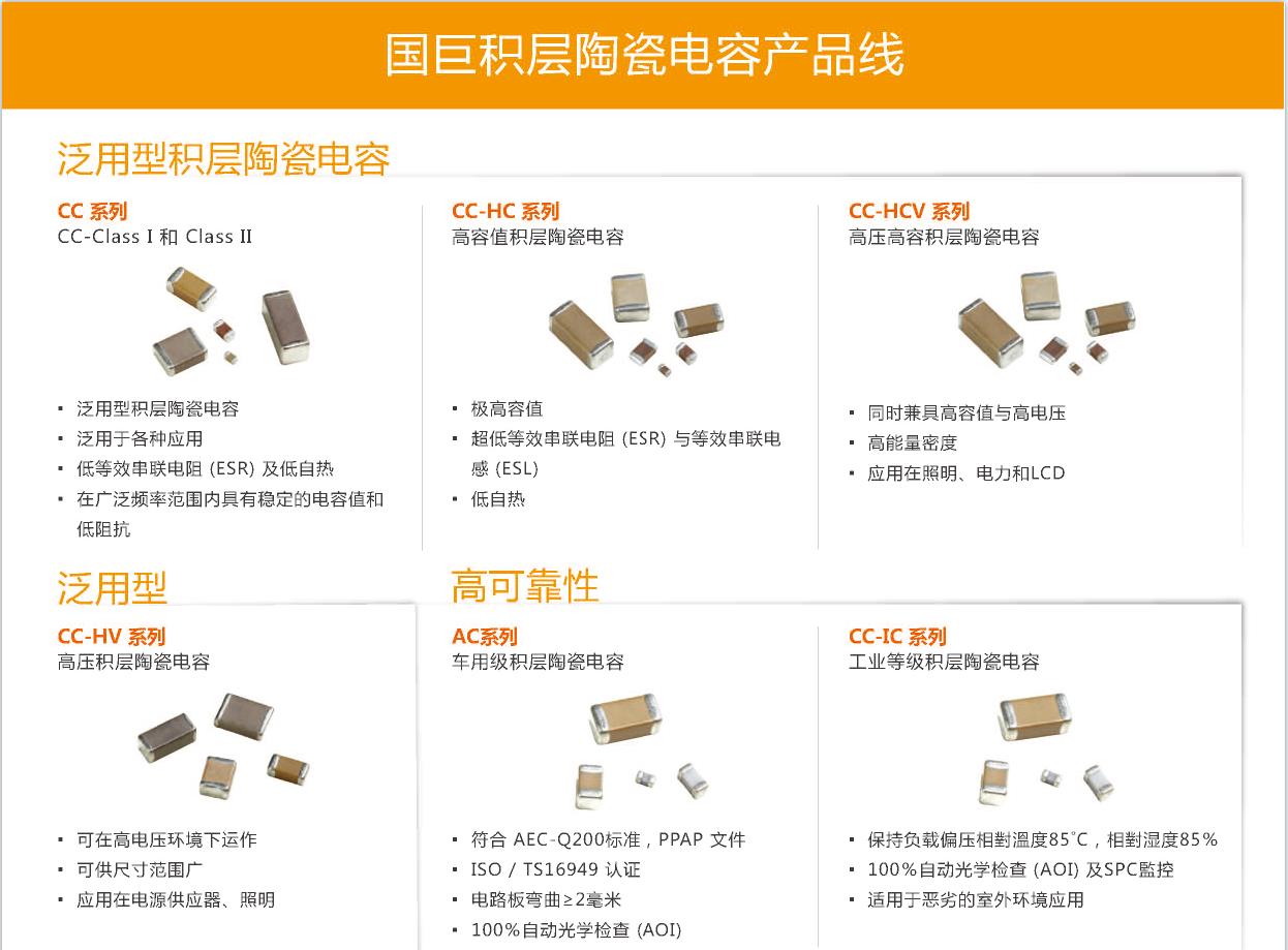 國(guó)巨貼片電容:通用型陶瓷電容,車用電容,高頻電容,軟端電極電容,微型化電容,排容,低感值電容