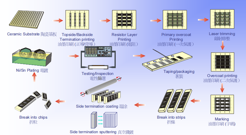 貼片電阻器電阻體材料 氧化釕類(lèi) 鎳鉻合金 電阻體厚度 >10um <1um 關(guān)鍵工藝 絲網(wǎng)印刷