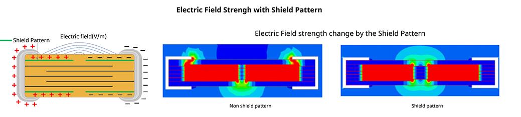 高壓MLCC結(jié)構(gòu)與一般MLCC 相比有何不同呢?在高電壓環(huán)境下需要確??煽啃?。暴露在高壓環(huán)境下的MLCC有Arc-ove的危險(xiǎn),MLCC內(nèi)部存在短路的危險(xiǎn)。當(dāng)向MLCC施加高電壓時(shí),MLCC周?chē)鷷?huì)形成強(qiáng)電場(chǎng)(Electric field),進(jìn)而產(chǎn)生ionized air。尤其是在MLCC端電極部位集中了大的電場(chǎng)(Electric field)。如果在Ionized air中超過(guò)了啟動(dòng)電壓(inception voltage)就會(huì)發(fā)生電 Arc,MLCC 內(nèi)部就會(huì)有發(fā)生circuit short 的危險(xiǎn)。防止這種現(xiàn)象產(chǎn)生的結(jié)構(gòu)是shield pattern。