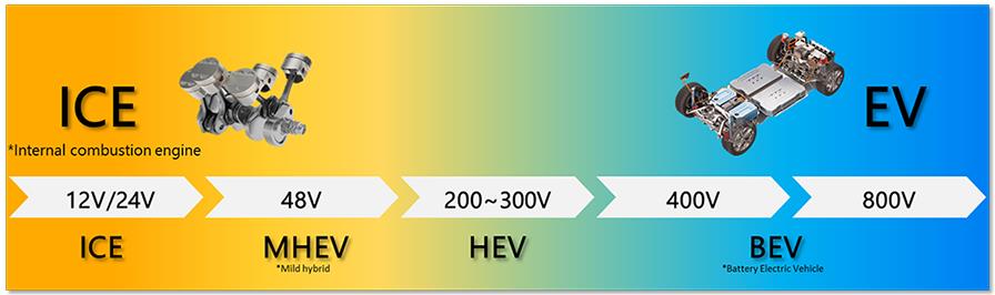 汽車(chē)電池的電壓上升與汽車(chē)的電氣化有關(guān)。汽車(chē)電池的電壓是如何變化的呢?在二十世紀(jì)五十年代中期之前汽車(chē)電壓為6V。隨著汽車(chē)發(fā)動(dòng)機(jī)容量的增大,需要大功率的Starter Motor,之后增加的電裝設(shè)備使電池電壓標(biāo)準(zhǔn)變?yōu)?2V。初創(chuàng)期的汽車(chē)需要的電壓很小,僅用于帶動(dòng)Crank及收音機(jī)。但隨著汽車(chē)安全設(shè)備的增加、便利配置的改善等,隨著時(shí)間的推移,增加的電子設(shè)備越來(lái)越多。由于所需的電力也隨之增加,關(guān)于在12V系統(tǒng)中提高電壓的問(wèn)題一直被討論。二十世紀(jì)九十年代提出了42V系統(tǒng),2011年德國(guó)汽車(chē)制造商制定了48V電壓標(biāo)準(zhǔn)。此后混合動(dòng)力汽車(chē)和電動(dòng)汽車(chē)開(kāi)始使用高電壓。電力(Watt)為電壓(V)*電流(A)。提高電壓能夠更有效地提升電力。提升電流的話必須加厚電纜厚度,連接器也需要變更。如果提升電流,硬件成本就會(huì)上升,因此提升電壓更為有效。