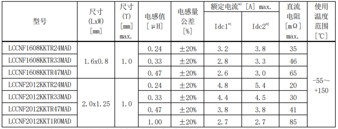 *3 額定電流值為能夠滿足直流重疊允許電流和溫度上升允許電流的直流電流值 * 需要根據(jù)周圍溫度進(jìn)行額定電流的降額。