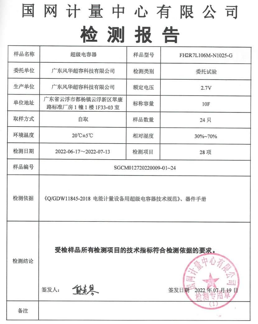 7月下旬,風(fēng)華高科超級(jí)電容器產(chǎn)品在國(guó)網(wǎng)計(jì)量中心順利通過(guò)測(cè)試認(rèn)證,該認(rèn)證表明風(fēng)華高科超容產(chǎn)品完全符合國(guó)家電網(wǎng)智能電表的嚴(yán)格要求。