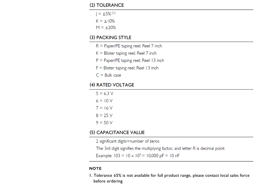 電容公差:J = ±5%、±10%(K)、±20%(M)