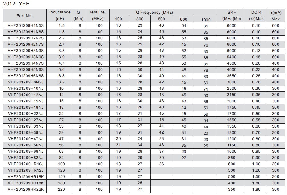 電感公差:S:±0.3nH;D:±0.5nH;J:±5%;K:±10%;M:±20%;